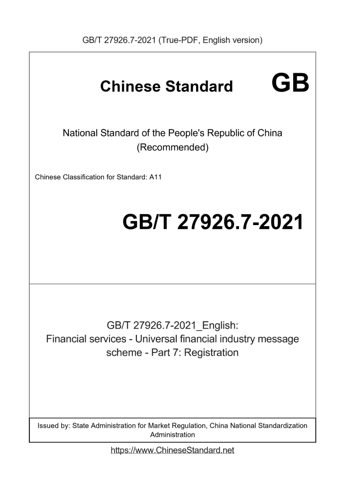 Delivery: <= 3 days. True-PDF full-copy in English will be manually translated and delivered via email. GB/T 27926.7-2021: Financial services - Universal financial industry message scheme - Part 7: Registration Status: Valid