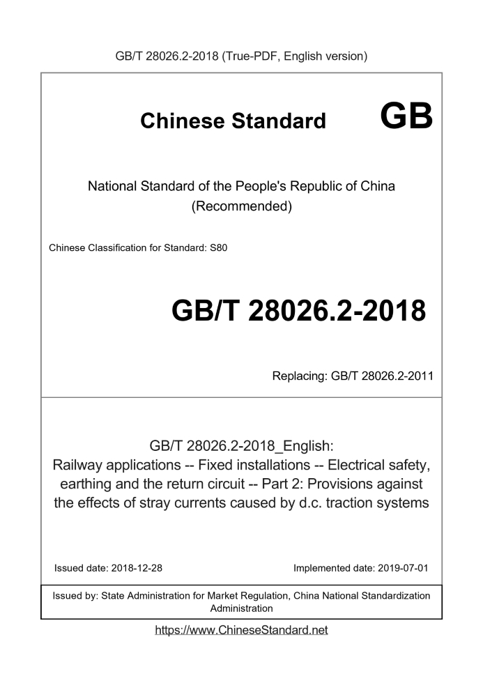 Basic dataStandard ID: GB/T 28026.2-2018 (GB/T28026.2-2018)Description (Translated English): Railway applications -- Fixed installations -- Electrical safety, earthing and the return circuit -- Part 2: Provisions against the effects of stray currents caused by d.c. traction systems Sector / Industry: National Standard (Recommended) Classification of Chinese Standard: S80 Classification of International Standard: 45.060 Word Count Estimation: 26,268 Date of Issue: 2018-12-28 Date of Implementation: 2019-07-01 Older Standard (superseded by this standard): GB/T 28026.2-2011 Issuing agency(ies): State Administration for Market Regulation, China National Standardization Administration GB/T 28026.2-2018: Railway applications -- Fixed installations -- Electrical safety, earthing and the return circuit -- Part 2: Provisions against the effects of stray currents caused by d.c. traction systems---This is a DRAFT version for illustration, not a final translation. Full copy of true-PDF in English version (including equations, symbols, images, flow-chart, tables, and figures etc.) will be manually/carefully translated upon your order. Railway applications--Fixed installations--Electrical safety,earthing and the return circuit--Part 2. Provisions against the effects of stray currents caused by dctraction systems ICS 45.060 S80 National Standards of People's Republic of China Replace GB/T 28026.2-2011 Rail transit ground device electrical safety, Grounding and reflow Part 2. DC traction Protective measures for stray current in power supply systems earthingandthereturncircuit-Part 2. Provisionsagainstthe (IEC 62128-2.2013, MOD) 2018-12-28 released.2019-07-01 implementation State market supervision and administration China National Standardization Administration issued ContentForeword III 1 Scope 1 2 Normative references 1 3 Terms and Definitions 1 4 Identification of hazards and risks 1 5 Stray current evaluation and acceptance criteria 2 6 Design Regulations 4 7 Requirements for affected structures 6 8 Protection methods for metal structures 7 9 garage and workshop 8 10 Test and Measurement 8 Appendix A (informative) Stray current and its impact on metal structure 10 Appendix B (informative) Line characteristics measurement 12 Appendix C (informative) Stray current evaluation through rail potential evaluation rail insulation 19 Reference 21ForewordGB/T 28026 "Electrical safety, grounding and reflow of rail transit ground devices" is divided into three parts. --- Part 1. Electric shock protection measures; ---Part 2. Protective measures for stray currents in DC traction power supply systems; --- Part 3. Interaction of AC and DC traction power systems. This part is the second part of GB/T 28026. This part is drafted in accordance with the rules given in GB/T 1.1-2009. This part replaces GB/T 28026.2-2011 "railway ground equipment - Part 2. Straight current system stray current protection Measures, compared with GB/T 28026.2-2011, the main technical changes are as follows. --- Added normative references GB/T 1402 and GB/T 28026.3-2018 (see Chapter 2); ---Modified terms and definitions, directly defined to reference GB/T 28026.1-2018 (see Chapter 3, Chapter 3 of the.2011 edition); --- Modified the range affected by stray currents (see Chapter 4, 4.3 of the.2011 edition); --- Modified important parameters affecting the magnitude of stray current (see 5.1, 5.1 of the.2011 edition); --- Revised the limit on the average value of the structure to ground potential during the peak period of transportation for metal reinforced concrete or metal structures, 100mV increased to.200mV (see 5.3,.2011 version 7.2.3); --- Revised the general requirements for the recirculation system (see 6.2.1,.2011 version 6.1); ---Modified the regulation of the track resistance and measures to reduce the longitudinal resistance of the rail (see 6.2.2, 6.1.2 of the.2011 edition); --- Modified the requirements for return conductors (see 6.2.4, 5.5 of the.2011 edition); --- Revised the relationship requirements for the reflow system and the ground-insulated device (see 6.2.6,.2011 edition of 6.2.1); --- Revised "in the case of closed roadbed, the level of the road should be avoided, the conductivity is significantly higher than the conventional value of the track connection", and changed to “In the case of closed roadbed, the conductivity at the level crossing should not be higher than the adjacent line” (see 6.1, 6.1.1.2 of the.2011 edition); --- Revised the requirements for the insulation level of the track (see 6.7, 5.3 of the.2011 edition); --- Revised the title of the article, "tunnel structure" was changed to "tunnel, bridge, viaduct and reinforced concrete track bed", and is described below Expand the scope of application (see 7.2, 7.2 of the.2011 edition). This section uses the redrafting method to modify the electrical safety, grounding and return of IEC 62128-2.2013 "railway ground devices". Flow Part 2. Protective measures for stray current in DC traction power supply systems. This section is structurally adjusted compared to IEC 62128-2.2013. The appendix is arranged in the order mentioned in the article. Appendix A is adjusted to Appendix B, Appendix B is adjusted to Appendix C, and Appendix C is adjusted to Appendix A. There are technical differences in this section compared to IEC 62128-2.2013, and the terms involved in these differences have been passed on the outside margins. The vertical single line (|) of the position is marked. The specific technical differences and their causes are as follows. ---About the normative reference documents, this part has made technical adjustments to adapt to China's technical conditions, adjustments The situation is reflected in Chapter 2, “Regulatory Citations”, and the specific adjustments are as follows. ● Replace IEC 60850 with GB/T 1402 modified to international standards (see 6.2.6); ● Replace IEC 62128-1 with GB/T 28026.1-2018 modified to international standards (see C