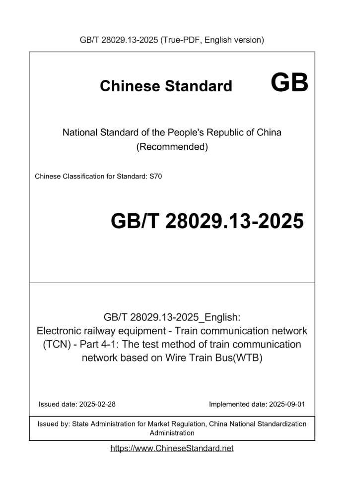 Basic dataStandard ID: GB/T 28029.13-2025 (GB/T28029.13-2025)Description (Translated English): Electronic railway equipment - Train communication network (TCN) - Part 4-1: The test method of train communication network based on Wire Train Bus(WTB) Sector / Industry: National Standard (Recommended) Classification of Chinese Standard: S70 Classification of International Standard: 45.060 Word Count Estimation: 18,199 Date of Issue: 2025-02-28 Date of Implementation: 2025-09-01 Issuing agency(ies): State Administration for Market Regulation, China National Standardization Administration GB/T 28029.13-2025: Electronic railway equipment - Train communication network (TCN) - Part 4-1: The test method of train communication network based on Wire Train Bus(WTB)---This is a DRAFT version for illustration, not a final translation. Full copy of true-PDF in English version (including equations, symbols, images, flow-chart, tables, and figures etc.) will be manually/carefully translated upon your order. GB/T 28029.13-2025 English version. Electronic railway equipment - Train communication network (TCN) - Part 4-1.The test method of train communication network based on Wire Train Bus(WTB) ICS 45.060 CCSS30 National Standard of the People's Republic of China Rail Transit Electronic Equipment Train Communication Network (TCN) Part 4-1.Wire Train Bus (WTB) based Train communication network test method Part 4-1.Thetestmethodoftraincommunicationnetworkbasedon WireTrainBus(WTB) Released on 2025-02-28 2025-09-01 Implementation State Administration for Market Regulation The National Standardization Administration issued Table of ContentsPreface III Introduction IV 1 Scope 1 2 Normative references 1 3 Terms and Definitions 1 4 Abbreviations 2 5 General Principles 2 6 Test categories and items 3 7 Test methods 4 Reference 12ForewordThis document is in accordance with the provisions of GB/T 1.1-2020 "Guidelines for standardization work Part 1.Structure and drafting rules for standardization documents" Drafting. This document is Part 4-1 of GB/T 28029 "Train Communication Network (TCN) for Rail Transit Electronic Equipment". The following parts have been published. --- Part 1.Basic structure; --- Part 2-1.Wire Train Bus (WTB); --- Part 2-2.Wire Train Bus (WTB) conformance test; --- Part 2-3.TCN communication protocol; --- Part 2-4.TCN application protocol; --- Part 2-5.Ethernet Train Backbone (WLTB); --- Part 2-6.Vehicle-to-ground communication; --- Part 2-7.Wireless Train Backbone (WLTB); --- Part 3-1.Multifunction Vehicle Bus (MVB); --- Part 3-2.Multifunction Vehicle Bus (MVB) conformance test; --- Part 3-3.CANopen Group Network (CCN); --- Part 3-4.Ethernet Grouped Network (ECN); --- Part 4-1.Test methods for train communication networks based on wired train bus (WTB). This document is proposed by the National Railway Administration. This document is under the jurisdiction of the National Rail Transit Electrical Equipment and System Standardization Technical Committee (SAC/TC278). This document was drafted by. CRRC Zhuzhou Electric Locomotive Research Institute Co., Ltd., China Railway Certification and Inspection Zhuzhou Traction Electrical Equipment Inspection Station Co., Ltd. Company, China Academy of Railway Sciences Group Co., Ltd. Locomotive and Rolling Stock Research Institute, CRRC Qingdao Sifang Locomotive and Rolling Stock Co., Ltd., CRRC Qingdao Sifang Rolling Stock Research Institute Co., Ltd., CRRC Changchun Railway Vehicles Co., Ltd., and China Railway Inspection and Certification Center Co., Ltd. The main drafters of this document are. Xiao Jiabo, Shen Hui, Zhong Sheng, Luo Yuan, Zhou Yonggang, Li Xiaoyong, Peng Yunlong, Xu Dongchao, Li Hailong and Yang Peng.IntroductionThe TCN network is the core component of the train, involving the quality and safety of train operation. GB/T 28029.3 stipulates the WTB equipment This document supplements the test methods for TCN communication performance, guidance data for train network system design optimization, and train Reference for communication troubleshooting. This document guides TCN communication performance testing, accumulates original test data, and optimizes subsequent network design. GB/T 28029 is planned to consist of fourteen parts. --- Part 1.Basic structure. The purpose is to specify the general architecture of the train communication network (TCN) to achieve GB/T 28029 Compatibility between defined marshaling networks and backbone networks. --- Part 2-1.Twisted-wire train bus (WTB). The purpose is to specify the twisted-wire train bus (WTB). Applicable to open trains Data communication between trains and within trains. --- Part 2-2.Wire Train Bus (WTB) conformance test. The purpose is to specify the WTB conformance test method, requirements and borders. --- Part 2-3.TCN communication protocol. The purpose is to specify the communication protocol of the train communication network to ensure GB/T 28029.6 The defined Ethernet train backbone network interconnects each train set. --- Part 2-4.TCN application protocol. The purpose is to specify the application protocol of the train communication network to achieve communication between application software Communicate through the marshalling network defined in GB/T 28029.1 and the train backbone network defined in GB/T 28029.6. --- Part 2-5.Ethernet Train Backbone (WLTB). The purpose is to specify the requirements for the Ethernet Train Backbone (ETB) to meet An open train communication system based on Ethernet technology. --- Part 2-6.Vehicle-ground communication. The purpose is to specify the communication specifications between the vehicle-mounted system and the ground system. --- Part 2-7.Wireless Train Backbone (WLTB). The purpose is to specify the protocol of the wireless train backbone network based on radio The protocol stack is suitable for distributed powered freight trains. --- Part 2-8.Ethernet conformance testing. The purpose is to specify Ethernet conformance testing methods, require