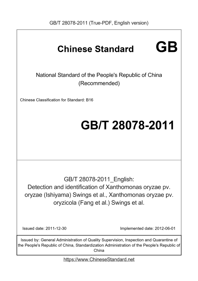Delivery: <= 4 days. True-PDF full-copy in English will be manually translated and delivered via email. GB/T 28078-2011: Detection and identification of Xanthomonas oryzae pv. oryzae (Ishiyama) Swings et al., Xanthomonas oryzae pv. oryzicola (Fang et al.) Swings et al. Status: Valid
