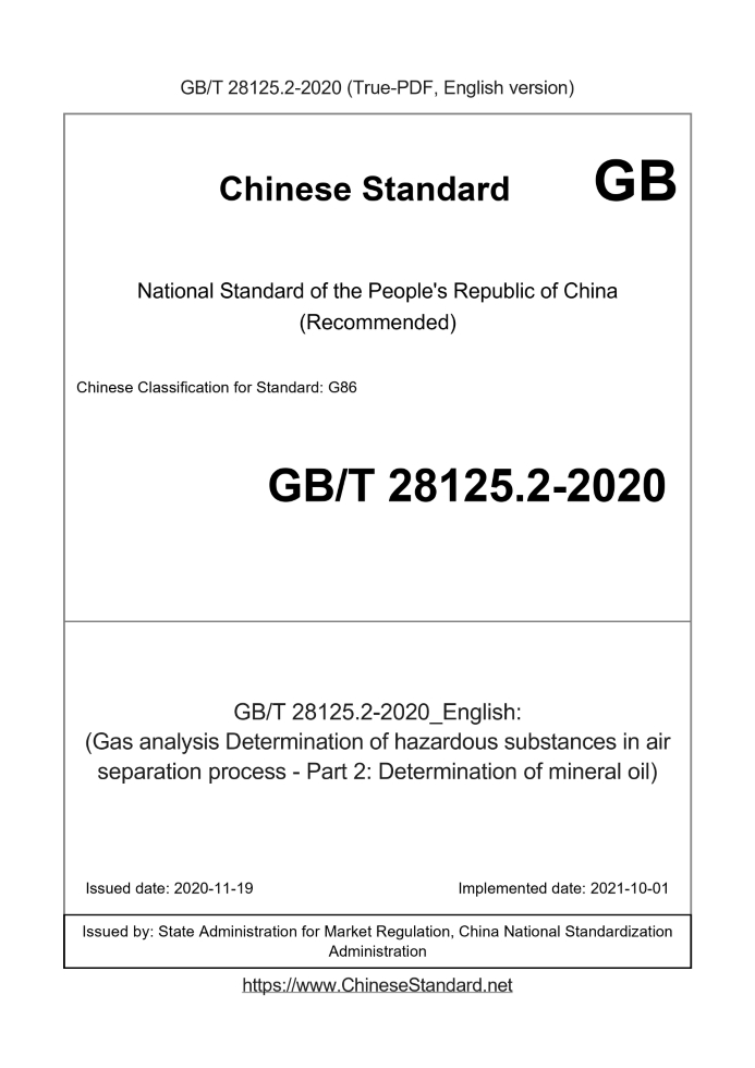Delivery: <= 3 days. True-PDF full-copy in English will be manually translated and delivered via email. GB/T 28125.2-2020: (Gas analysis Determination of hazardous substances in air separation process - Part 2: Determination of mineral oil) Status: Valid