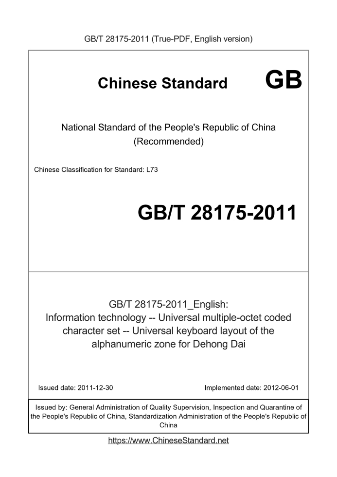 Delivery: <= 3 days. True-PDF full-copy in English will be manually translated and delivered via email. GB/T 28175-2011: Information technology -- Universal multiple-octet coded character set -- Universal keyboard layout of the alphanumeric zone for Dehong Dai Status: Valid