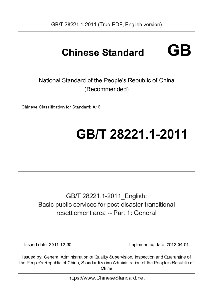 Delivery: <= 3 days. True-PDF full-copy in English will be manually translated and delivered via email. GB/T 28221.1-2011: Basic public services for post-disaster transitional resettlement area -- Part 1: General Status: Valid