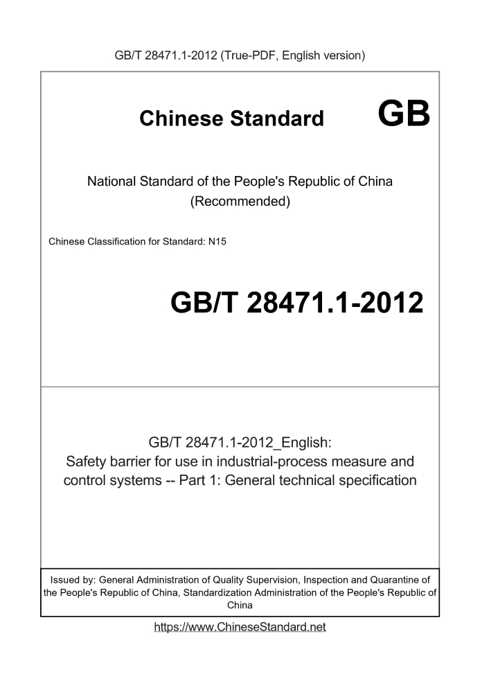 Delivery: <= 3 days. True-PDF full-copy in English will be manually translated and delivered via email. GB/T 28471.1-2012: Safety barrier for use in industrial-process measure and control systems -- Part 1: General technical specification Status: Valid