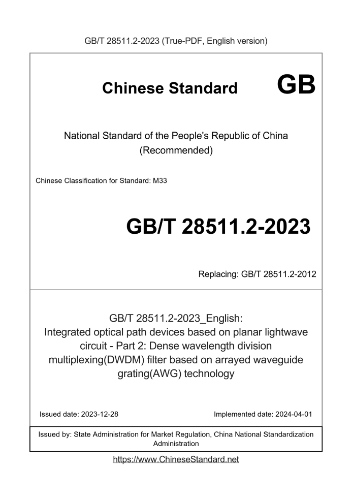 Basic dataStandard ID: GB/T 28511.2-2023 (GB/T28511.2-2023)Description (Translated English): Integrated optical path devices based on planar lightwave circuit - Part 2: Dense wavelength division multiplexing(DWDM) filter based on arrayed waveguide grating(AWG) technology Sector / Industry: National Standard (Recommended) Classification of Chinese Standard: M33 Classification of International Standard: 33.180.20 Word Count Estimation: 30,374 Date of Issue: 2023-12-28 Date of Implementation: 2024-04-01 Older Standard (superseded by this standard): GB/T 28511.2-2012 Issuing agency(ies): State Administration for Market Regulation, China National Standardization Administration GB/T 28511.2-2023: Integrated optical path devices based on planar lightwave circuit - Part 2: Dense wavelength division multiplexing(DWDM) filter based on arrayed waveguide grating(AWG) technology---This is a DRAFT version for illustration, not a final translation. Full copy of true-PDF in English version (including equations, symbols, images, flow-chart, tables, and figures etc.) will be manually/carefully translated upon your order. ICS 33:180:20 CCSM33 National Standards of People's Republic of China Replace GB/T 28511:2-2012 Planar optical waveguide integrated optical circuit device Part 2: Arrayed Waveguide Grating (AWG) Based Dense Wavelength Division Multiplexing (DWDM) Filters Published on 2023-12-28 2024-04-01 Implementation State Administration for Market Regulation Released by the National Standardization Administration Committee Table of contentsPreface III Introduction V 1 Scope 1 2 Normative references 1 3 Terms and Definitions 1 4 Abbreviations 5 5 categories 5 6 Technical requirements 5 7 Test methods 12 8 Reliability test 15 9 Inspection Rules 17 10 Marking, packaging, transportation and storage18 Appendix A (Normative) AWG filter frequency/wavelength allocation schedule 19 Appendix B (informative) Thermal sensitive AWG filter electrical interface 21 Appendix C (informative) Thermal sensitive AWG filter outline diagram 22 Appendix D (informative) Thermal insensitive AWG filter outline diagram 23ForewordThis document complies with the provisions of GB/T 1:1-2020 "Standardization Work Guidelines Part 1: Structure and Drafting Rules of Standardization Documents" Drafting: This document is Part 2 of GB/T 28511 "Planar Optical Waveguide Integrated Optical Circuit Devices": GB/T 28511 has released the following part: ---Part 1: Optical power splitter based on planar optical waveguide (PLC); ---Part 2: Dense wavelength division multiplexing (DWDM) filters based on arrayed waveguide grating (AWG) technology: This document replaces GB/T 28511:2-2012 "Planar optical waveguide integrated optical circuit devices - Part 2: Arrayed waveguide grating based (AWG) technology Dense Wavelength Division Multiplexing (DWDM) filter", compared with GB/T 28511:2-2012, except for structural adjustments and editorial changes In addition, the main technical changes are as follows: a) Change the term "peak wavelength" to "center wavelength" (see 3:3, 3:3 in the:2012 version); b) Added the term and definition of "flatness" (see 3:6) and deleted "set temperature stability" (see 3:11 of the:2012 version); c) Changed the "Wavelength Accuracy", "Insertion Loss", "Bandwidth", "Adjacent Channel Crosstalk", "Non-Adjacent Channel Crosstalk" and Definition of the term “total crosstalk” (see 3:4, 3:5, 3:7, 3:8, 3:9, 3:10, 3:4, 3:5, 3:6, 3:7, 3:8, 3:9 of the:2012 edition); d) The operating wavelength of the C-band AWG filter has been changed [see 5:1, 4:1a) of the:2012 edition]; e) Increased the operating wavelength of C-band AWG filter (see 5:1); f) Changed the non-adjacent channel crosstalk and total crosstalk optical performance parameters of the 100GHz channel spacing flat-top thermally insensitive AWG filter Number (see Table 5, Table 3 of the:2012 edition); g) Added optical performance parameters of 50GHz channel spacing flat-top heat-sensitive AWG filter (see Table 3); h) Added optical performance parameters of 50GHz channel spacing flat-top thermally insensitive AWG filter (see Table 6); i) Added optical performance parameters of industrial-grade flat-top thermally insensitive AWG filter (see Table 7); j) Added optical performance parameters of industrial-grade single-fiber bidirectional flat-top thermally insensitive AWG filter (see Table 8); k) Added optical performance parameters of ultra-wide spectrum flat-top thermally insensitive AWG filter (see Table 9); l) Added requirements for extreme working conditions (see Table 10); m) The return loss tester in the test instrument is deleted (see 5:3:7 of the:2012 version); n) The reference standards, test conditions, and failure criteria of the reliability test have been changed, and environmental requirements have been added (see Chapter 8,:2012 version of 5:5); o) Delete dispersion and polarization mode dispersion in daily inspection (see 6:2:1 of the:2012 version); p) Added specific requirements for type inspection (see 9:3:2, 9:3:3, 9:3:4, 9:3:5, 9:3:6, 9:3:7); q) Added specific requirements for marking (see 10:1); r) Added specific requirements for storage (see 10:4); s) 8 frequencies/wavelengths have been added to the AWG filter frequency/wavelength allocation schedule (see Table A:1); t) Changed the signals and types defined by the AWG filter electrical interface (see Table B:1, Table B:1 of the:2012 version); u) Delete "50GHz channel spacing flat-top thermally insensitive AWG filter optical performance parameters" (see Appendix C of the:2012 version); v) Added "Thermal Insensitive AWG Filter Outline Diagram" (see Appendix D): Please note that some content in this document may be subject to patents: The publisher of this document assumes no responsibility for identifying patents: This document is proposed by the Ministry of Industry and Information Technology of the People's Republic of China: This document is under the jurisdiction of the National Communications Standardizat