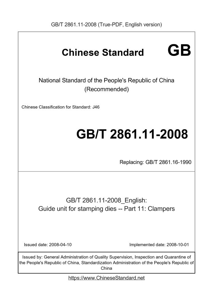 Delivery: <= 2 days. True-PDF full-copy in English will be manually translated and delivered via email. GB/T 2861.11-2008: Guide unit for stamping dies -- Part 11: Clampers Status: Valid GB/T 2861.11: Historical versions