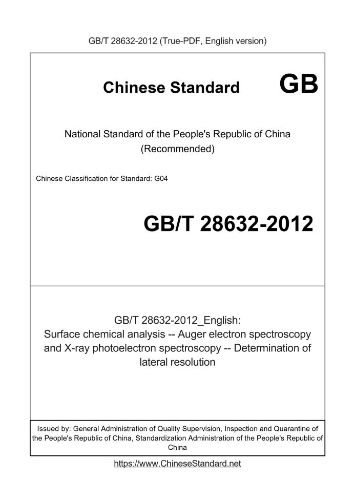 Delivery: <= 3 days. True-PDF full-copy in English will be manually translated and delivered via email. GB/T 28632-2012: Surface chemical analysis -- Auger electron spectroscopy and X-ray photoelectron spectroscopy -- Determination of lateral resolution Status: Valid