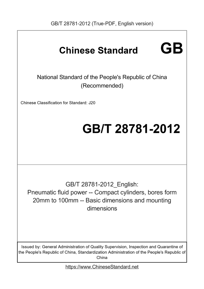 Delivery: <= 3 days. True-PDF full-copy in English will be manually translated and delivered via email. GB/T 28781-2012: Pneumatic fluid power -- Compact cylinders, bores form 20mm to 100mm -- Basic dimensions and mounting dimensions Status: Valid