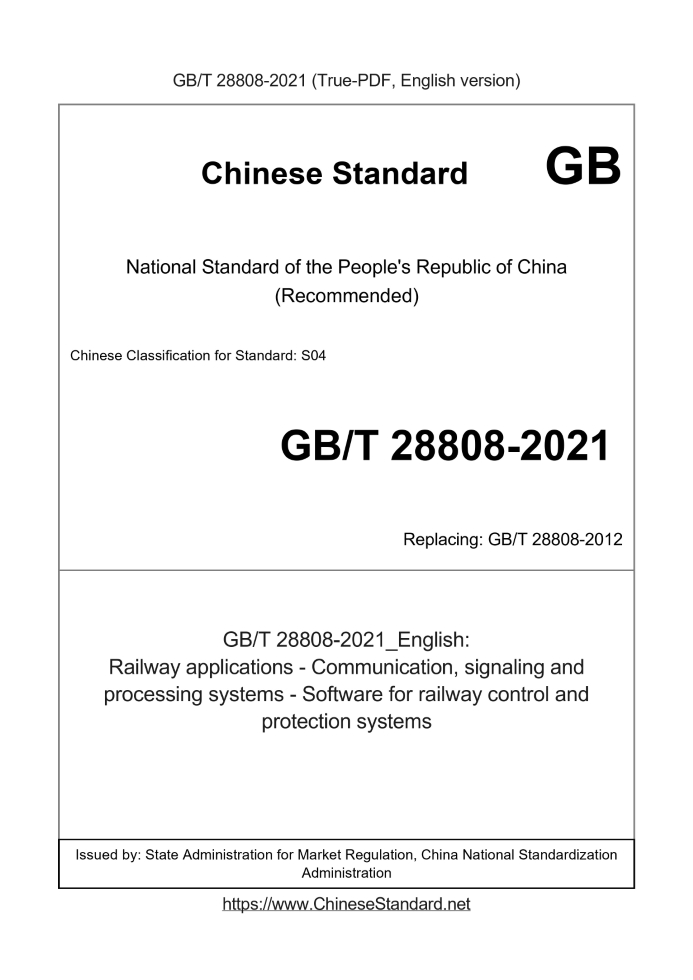 Delivery: <= 10 days. True-PDF full-copy in English will be manually translated and delivered via email. GB/T 28808-2021: Railway applications - Communication, signaling and processing systems - Software for railway control and protection systems Status: Valid GB/T 28808: Historical versions