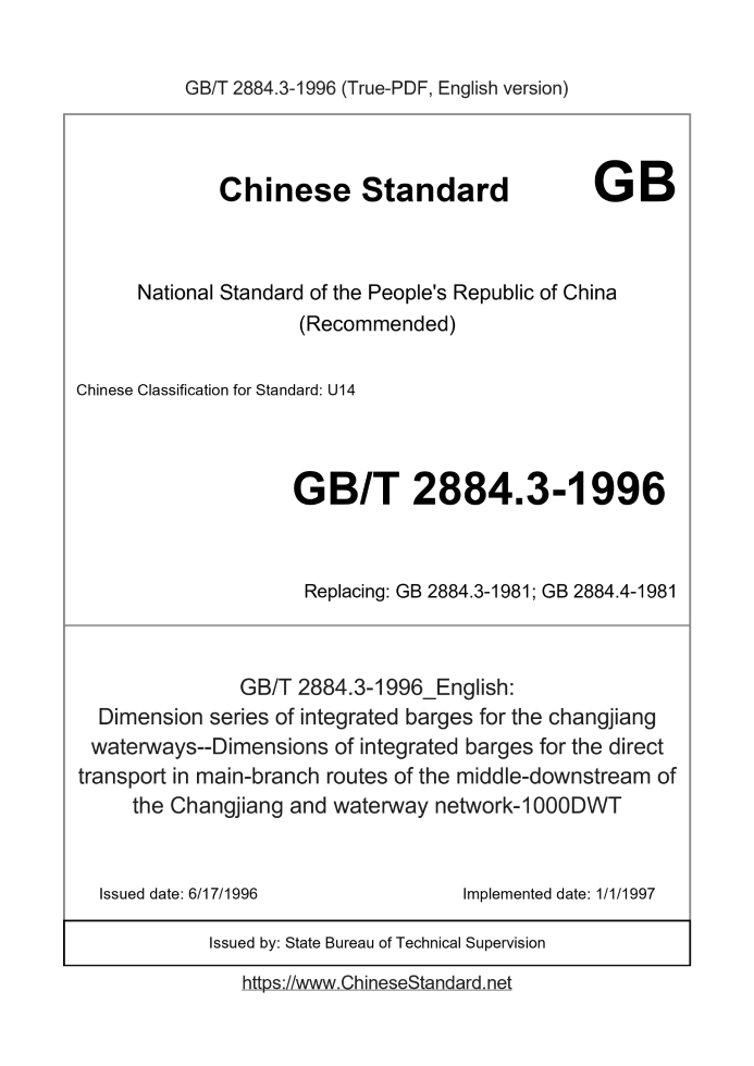 GB/T 2884.3-1996199 Add to Cart 2 days Dimension series of integrated barges for the changjiang waterways--Dimensions of integrated barges for the direct transport in main-branch routes of the middle-downstream of the Changjiang and waterway network-1000DWT Obsolete