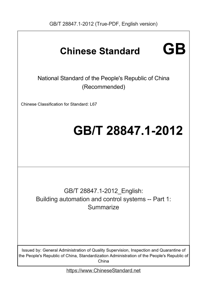 Delivery: <= 3 days. True-PDF full-copy in English will be manually translated and delivered via email. GB/T 28847.1-2012: Building automation and control systems -- Part 1: Summarize Status: Valid