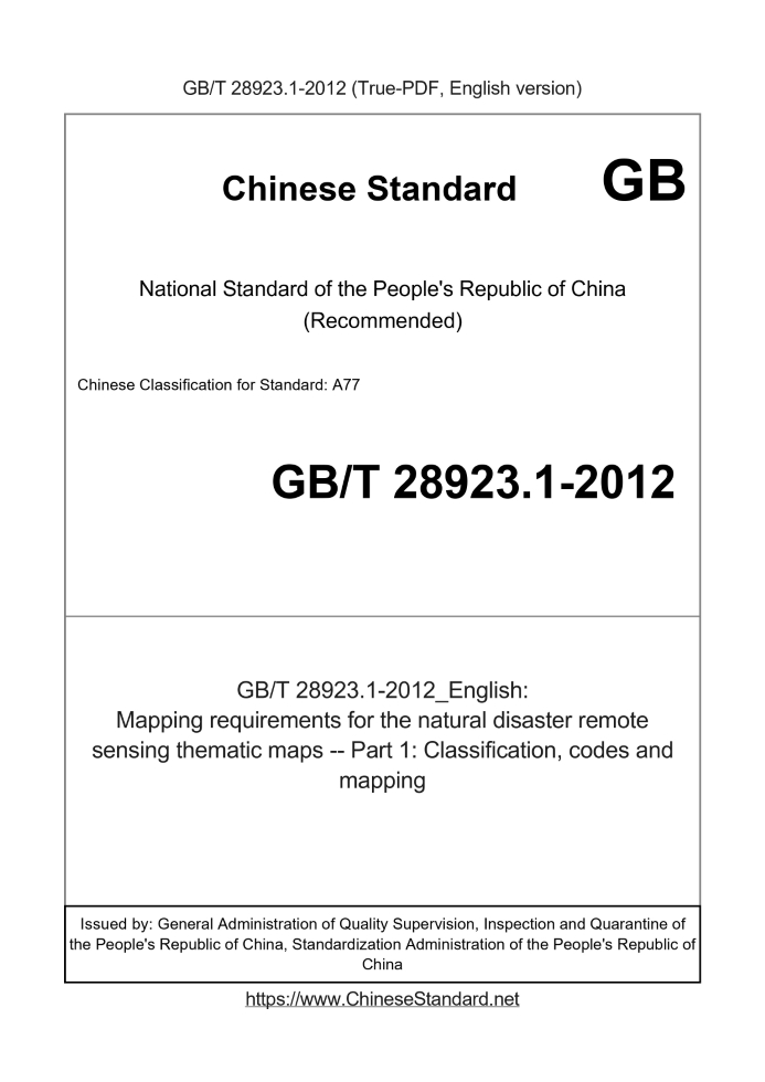 Delivery: <= 3 days. True-PDF full-copy in English will be manually translated and delivered via email. GB/T 28923.1-2012: Mapping requirements for the natural disaster remote sensing thematic maps -- Part 1: Classification, codes and mapping Status: Valid