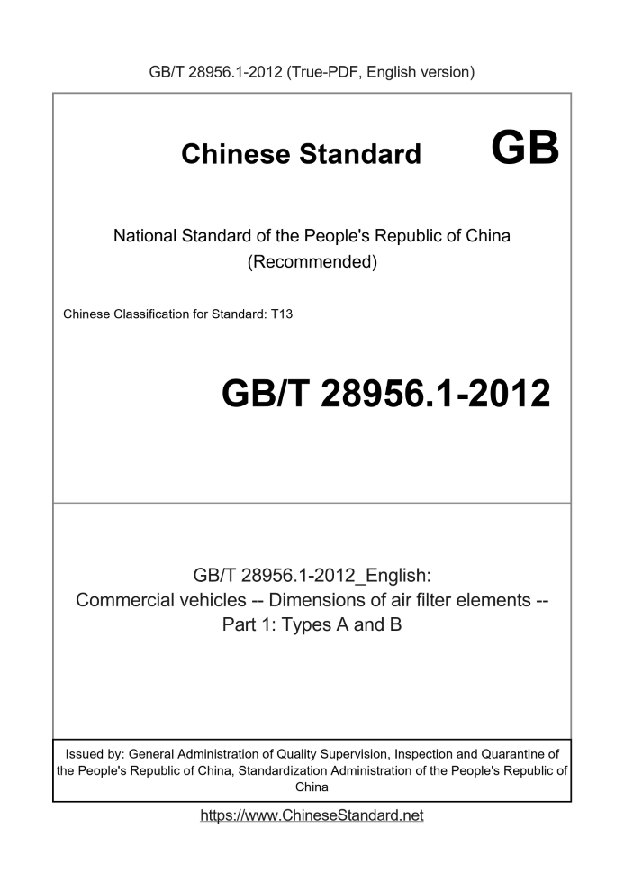 Delivery: <= 3 days. True-PDF full-copy in English will be manually translated and delivered via email. GB/T 28956.1-2012: Commercial vehicles -- Dimensions of air filter elements -- Part 1: Types A and B Status: Obsolete