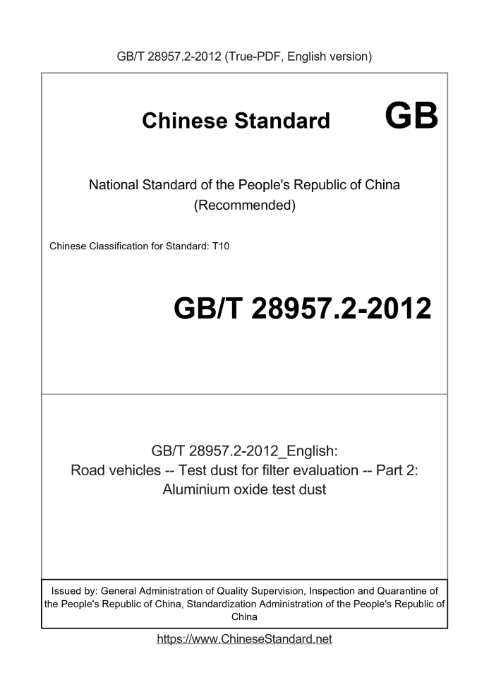 | GB/T 28957.2-2012 English PDFUS$224.00 · In stock Delivery: <= 3 days. True-PDF full-copy in English will be manually translated and delivered via email. GB/T 28957.2-2012: Road vehicles -- Test dust for filter evaluation -- Part 2: Aluminium oxide test dust Status: Valid