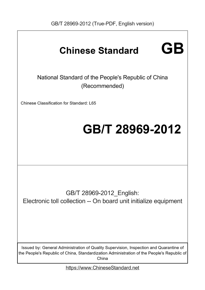 Delivery: <= 3 days. True-PDF full-copy in English will be manually translated and delivered via email. GB/T 28969-2012: Electronic toll collection -- On board unit initialize equipment Status: Valid