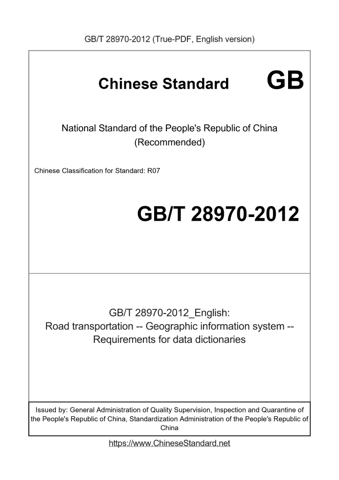 Delivery: <= 4 days. True-PDF full-copy in English will be manually translated and delivered via email. GB/T 28970-2012: Road transportation -- Geographic information system -- Requirements for data dictionaries Status: Valid