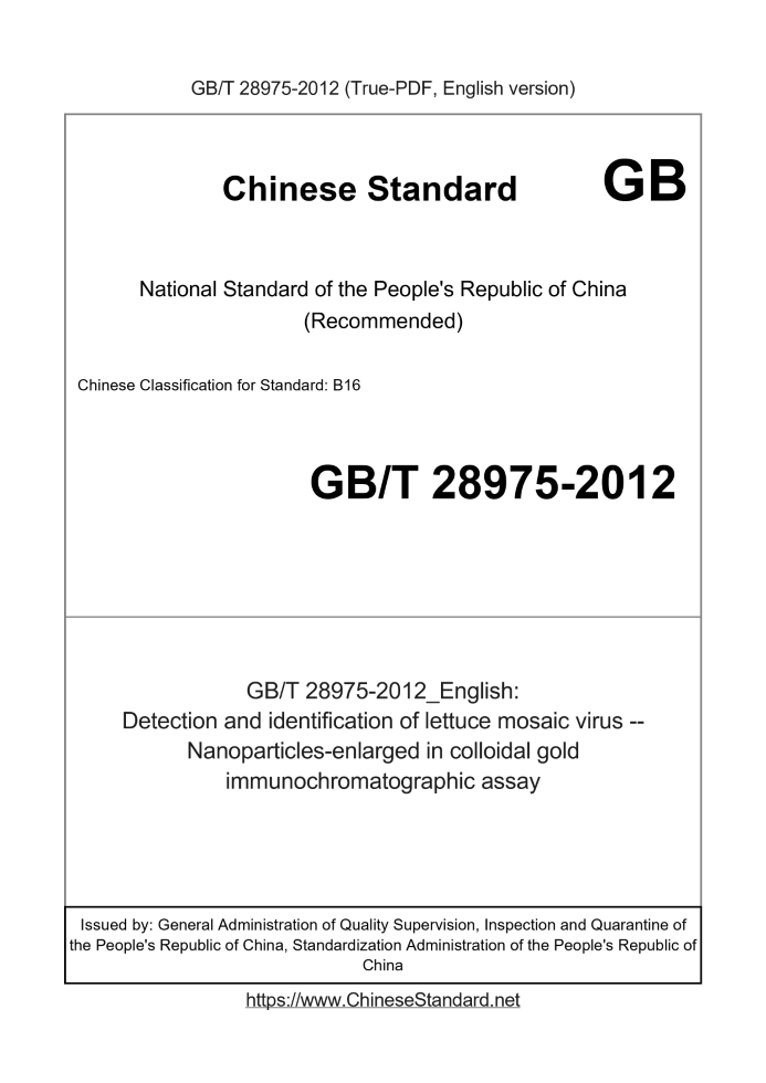 Delivery: <= 3 days. True-PDF full-copy in English will be manually translated and delivered via email. GB/T 28975-2012: Detection and identification of lettuce mosaic virus -- Nanoparticles-enlarged in colloidal gold immunochromatographic assay Status: Valid