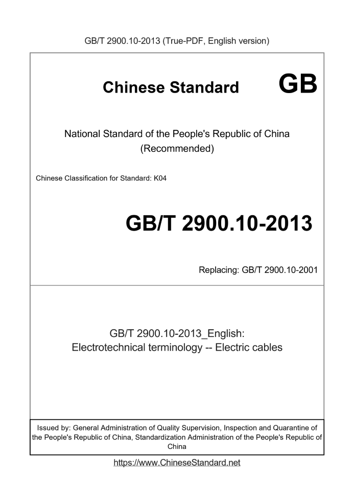Delivery: <= 3 days. True-PDF full-copy in English will be manually translated and delivered via email. GB/T 2900.10-2013: Electrotechnical terminology -- Electric cables Status: Valid GB/T 2900.10: Historical versions