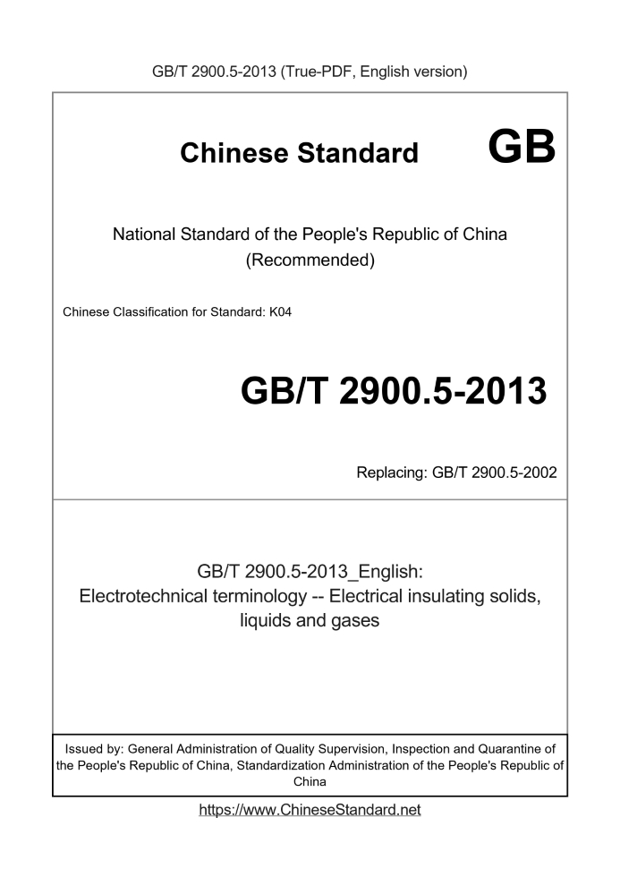 Delivery: <= 3 days. True-PDF full-copy in English will be manually translated and delivered via email. GB/T 2900.5-2013: Electrotechnical terminology -- Electrical insulating solids, liquids and gases Status: Valid GB/T 2900.5: Historical versions