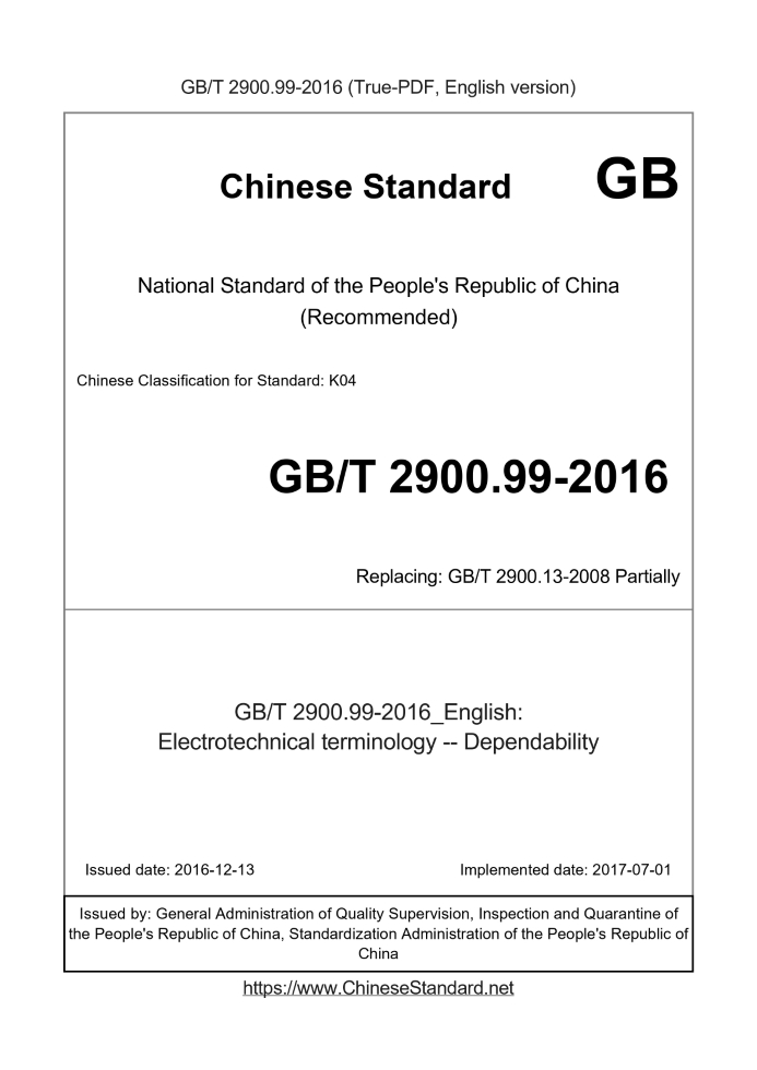 Delivery: <= 4 days. True-PDF full-copy in English will be manually translated and delivered via email. GB/T 2900.99-2016: Electrotechnical terminology -- Dependability Status: Valid