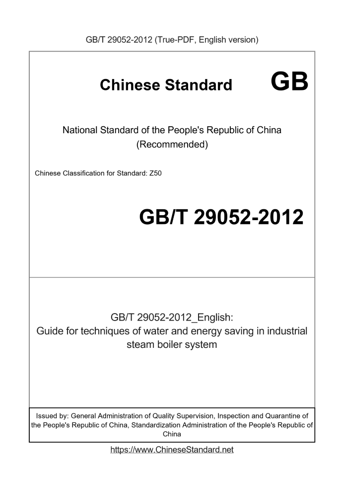 Delivery: <= 3 days. True-PDF full-copy in English will be manually translated and delivered via email. GB/T 29052-2012: Guide for techniques of water and energy saving in industrial steam boiler system Status: Valid
