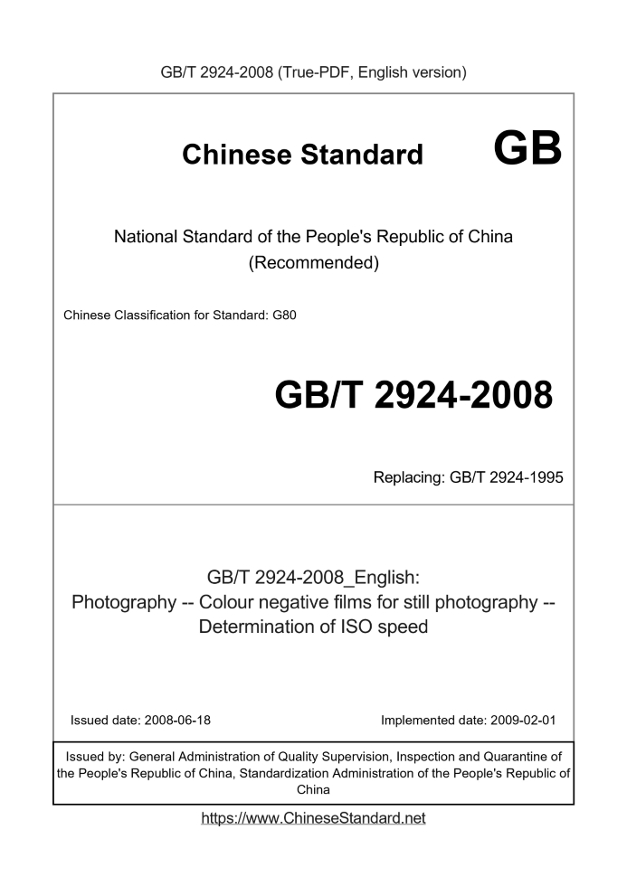 Delivery: <= 3 days. True-PDF full-copy in English will be manually translated and delivered via email. GB/T 2924-2008: Photography -- Colour negative films for still photography -- Determination of ISO speed Status: Valid GB/T 2924: Historical versions