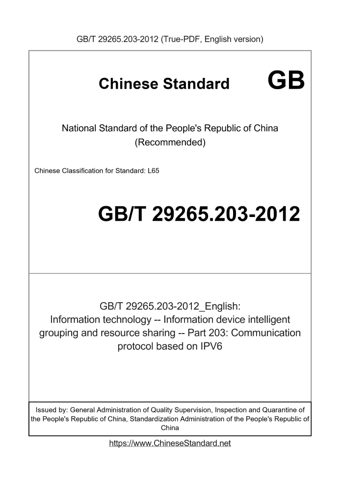 Basic dataStandard ID: GB/T 29265.203-2012 (GB/T29265.203-2012)Description (Translated English): Information technology -- Information device intelligent grouping and resource sharing -- Part 203: Communication protocol based on IPV6 Sector / Industry: National Standard (Recommended) Classification of Chinese Standard: L65 Classification of International Standard: 35.200 Word Count Estimation: 27,216 Quoted Standard: GB/T 15629.3; GB 15629.11; SJ/T 11310-2005; IETF RFC 2460; IETF RFC 3307; IETF RFC 3879; IETF RFC 4291; IETF RFC 6275 Regulation (derived from): National Standards Bulletin No. 41 of 2012 Issuing agency(ies): General Administration of Quality Supervision, Inspection and Quarantine of the People's Republic of China, Standardization Administration of the People's Republic of China Summary: This standard specifies the IGRS protocol IPV6 based on IGRS device networking mechanisms, resource sharing mechanisms involved in the interaction process equipment for the IPV6 expansion. This section applies to the IGRS device supports IPv6 network via GB/T 29265.203-2012: Information technology -- Information device intelligent grouping and resource sharing -- Part 203: Communication protocol based on IPV6---This is a DRAFT version for illustration, not a final translation. Full copy of true-PDF in English version (including equations, symbols, images, flow-chart, tables, and figures etc.) will be manually/carefully translated upon your order. Information technology Information device intelligent grouping and resource sharing Part 203. Communication protocol based on IPV6 ICS 35.200 L65 National Standards of People's Republic of China IT Information Equipment Resource Sharing Services Part 203. IPV6 based communication protocol resourcesharing-Part 203. CommunicationprotocolbasedonIPV6 Issued on. 2012-12-31 2013-07-01 implementation Administration of Quality Supervision, Inspection and Quarantine of People's Republic of China Standardization Administration of China released Table of ContentsPreface Ⅰ 1 Scope 1 2 Normative references 1 3 Terms and definitions 4 Abbreviations 2 5 IGRS the IPV6 Protocol Overview 3 5.1 General 3 5.2 Part position IGRS architecture 3 5.3 IGRS Protocol 4 of IPV6 IPV6 address 6 IGRS device 5 6.1 IPV6 unicast address 5 6.2 IPV6 multicast address 6 6.3 Anycast address 8 7 Support IPV6 of IGRS device communication 8 7.1 IPV6 support of IGRS Networking equipment 8 7.2 IGRS resource sharing 15 of IPV6 7.3 IGRS content distribution 19 8 IGRS mobile device 20 8.1 Mobile IPV6 20 21 Location Services 8.2 Application Layer Appendix A (informative) support IPV6 network of IGRS application scenarios 22 A.1 network of 22 A.2 support IPV6 network component of claim 22 IGRSForewordGB/T 29265 "Information Technology Information Equipment Resource Sharing Services" is divided into the following sections. --- Part 1. Architecture and Reference Model; --- Part 201. Basic Agreement; --- Part 202. Generic control underlying agreement; --- Part 203. IPV6 based communication protocol; --- Part 204. Gateway; --- Part 301. Equipment type; --- Part 302. type of service; --- Part 303. General description of the control device; --- Part 304. digital media content protection; --- Part 305. Powerline Communication Interface; --- Part 306. Quality of Service; --- Part 401. basic application; --- Part 402. multimedia applications; --- Part 403. Application file; --- Part 404. Application of digital video discs; --- Part 405. Media Center device; --- Part 406. multimedia network terminals and applications; --- Part 501. Test equipment; --- Part 502. Universal control equipment testing. This section GB/T 29265 Part 203. This section drafted in accordance with GB/T 1.1-2009 given rules. Please note that some of the content of this document may involve patents. Release mechanism of the present document does not assume responsibility for the identification of these patents. This part of the technical part of the National Technical Committee (SAC/TC28) and focal points. This section is drafted. IGRS Information Technology Engineering Center Co., Ltd., Beijing BII Information Technology Co., Lenovo Group has Ltd., Institute of Computing Technology, Shenzhen IGRS Information Technology Co., part of China Electronic Technology Research Institute. The main drafters of this section. to make Yin Jun, heavy Cao Ying, Luo Jia, Zhang Yujun, had Xiaobing, Zhang Jun, Sun Yuning, Huang Xiaolin, Zhang Weihua, Chen Gu, Fu Chen, Sun Zhiyong, Li Zhen, Sunchu Hui, Liu Ming, Wu East Asia, Zhuolan, Liu Dong, step Rixin, Cheng Yuan, Ding Luning. IT Information Equipment Resource Sharing Services Part 203. IPV6 based communication protocol1 ScopeThis section GB/T 29265 specifies the communication protocol of IPV6 IGRS, IGRS device networking mechanism for sharing of resources machine System and other equipment involved in the interaction were extended IPV6. This section applies to the IGRS support IPV6 IPV6 network equipment within the scope of the sharing of resources by wire or wireless means And collaboration services.2 Normative referencesThe following documents for the application of this document is essential. For dated references, only the dated version suitable for use herein Member. For undated references, the latest edition (including any amendments) applies to this document. GB/T 15629.3 LAN information processing systems - Part 3. Carrier Sense Multiple Access with Collision Detection (CSMA / CD) Access Method and Physical Layer Specifications Inter GB 15629.11 Information technology - Telecommunications and information exchange between local area networks and metropolitan area networks Specific requirements Part 11 Score. Wireless LAN Medium Access Control and Physical Layer Specifications SJ/T 11310-2005 Information Equipment Resource Sharing Services Part 1. Basic Agreement IETFRFC2460 Internet Protocol Version 6 (IPV6) (InternetProtocol, Version6 (IPv6) Specification) IETFRFC3307 IPV6 multicast address