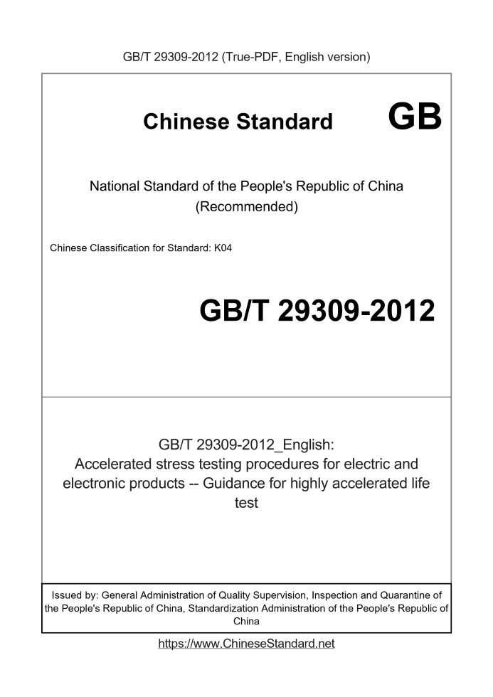 Delivery: <= 4 days. True-PDF full-copy in English will be manually translated and delivered via email. GB/T 29309-2012: Accelerated stress testing procedures for electric and electronic products -- Guidance for highly accelerated life test Status: Valid
