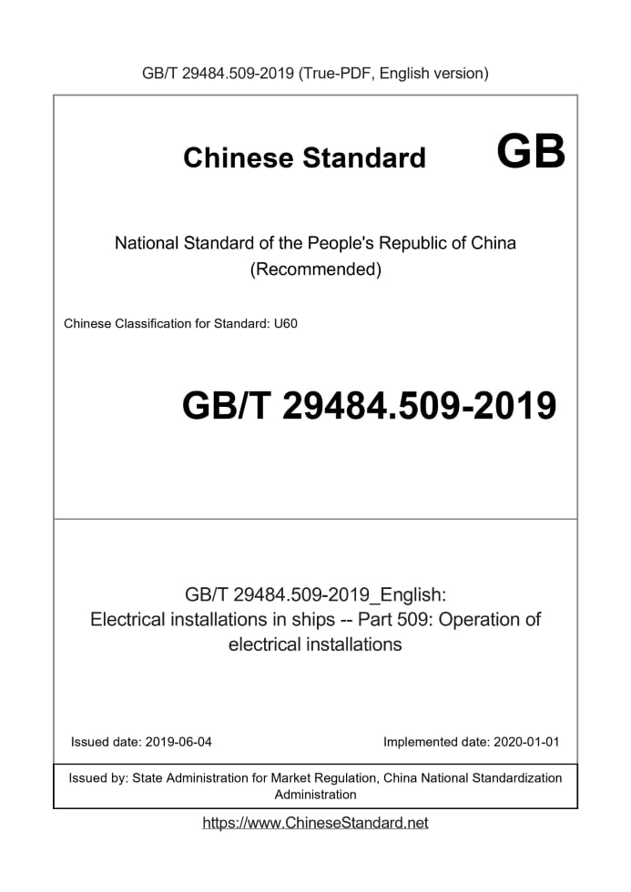 Delivery: <= 4 days. True-PDF full-copy in English will be manually translated and delivered via email. GB/T 29484.509-2019: Electrical installations in ships -- Part 509: Operation of electrical installations Status: Valid