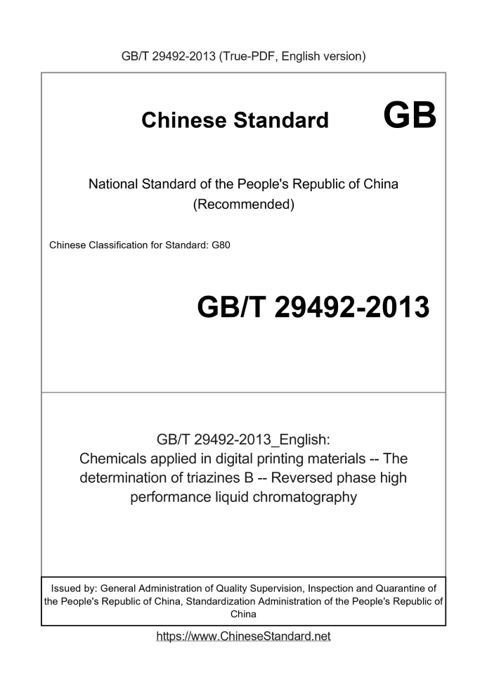 Delivery: <= 3 days. True-PDF full-copy in English will be manually translated and delivered via email. GB/T 29492-2013: Chemicals applied in digital printing materials -- The determination of triazines B -- Reversed phase high performance liquid chromatography Status: Valid