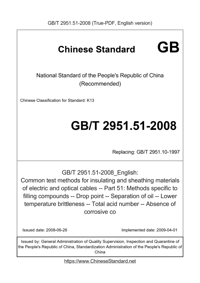 Delivery: <= 3 days. True-PDF full-copy in English will be manually translated and delivered via email. GB/T 2951.51-2008: Common test methods for insulating and sheathing materials of electric and optical cables -- Part 51: Methods specific to filling compounds -- Drop point -- Separation of oil -- Lower temperature brittleness -- Total acid number -- Absence of corrosive co Status: Valid
