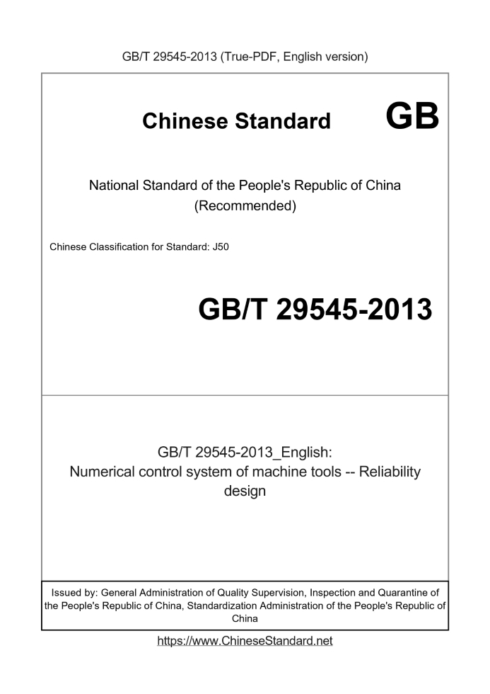 Delivery: <= 7 days. True-PDF full-copy in English will be manually translated and delivered via email. GB/T 29545-2013: Numerical control system of machine tools -- Reliability design Status: Valid