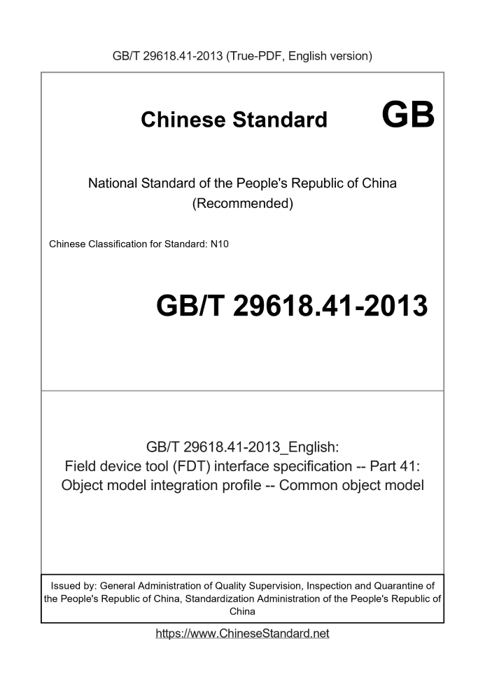 Delivery: <= 10 days. True-PDF full-copy in English will be manually translated and delivered via email. GB/T 29618.41-2013: Field device tool (FDT) interface specification -- Part 41: Object model integration profile -- Common object model Status: Valid