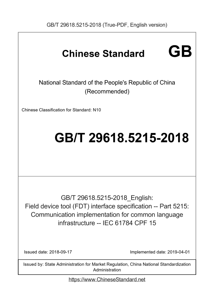 Delivery: <= 4 days. True-PDF full-copy in English will be manually translated and delivered via email. GB/T 29618.5215-2018: Field device tool (FDT) interface specification -- Part 5215: Communication implementation for common language infrastructure -- IEC 61784 CPF 15 Status: Valid