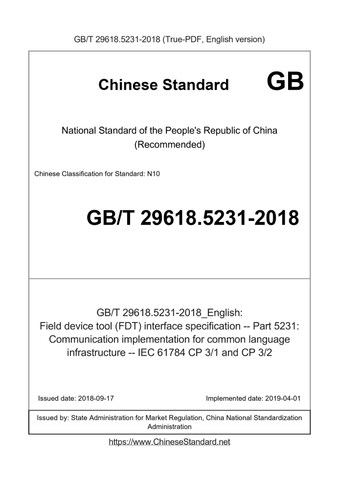 Delivery: <= 5 days. True-PDF full-copy in English will be manually translated and delivered via email. GB/T 29618.5231-2018: Field device tool (FDT) interface specification -- Part 5231: Communication implementation for common language infrastructure -- IEC 61784 CP 3/1 and CP 3/2 Status: Valid