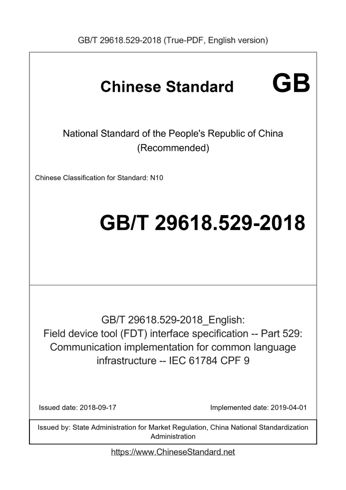 Delivery: <= 4 days. True-PDF full-copy in English will be manually translated and delivered via email. GB/T 29618.529-2018: Field device tool (FDT) interface specification -- Part 529: Communication implementation for common language infrastructure -- IEC 61784 CPF 9 Status: Valid
