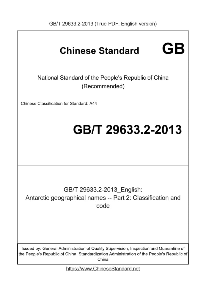 Delivery: <= 3 days. True-PDF full-copy in English will be manually translated and delivered via email. GB/T 29633.2-2013: Antarctic geographical names -- Part 2: Classification and code Status: Valid