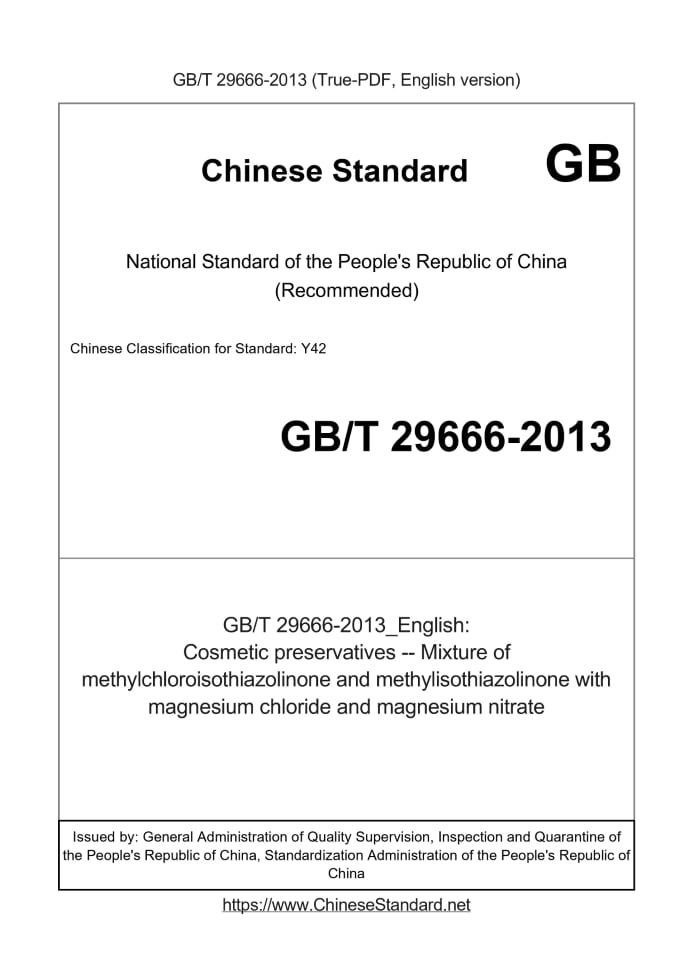 Delivery: <= 3 days. True-PDF full-copy in English will be manually translated and delivered via email. GB/T 29666-2013: Cosmetic preservatives -- Mixture of methylchloroisothiazolinone and methylisothiazolinone with magnesium chloride and magnesium nitrate Status: Valid