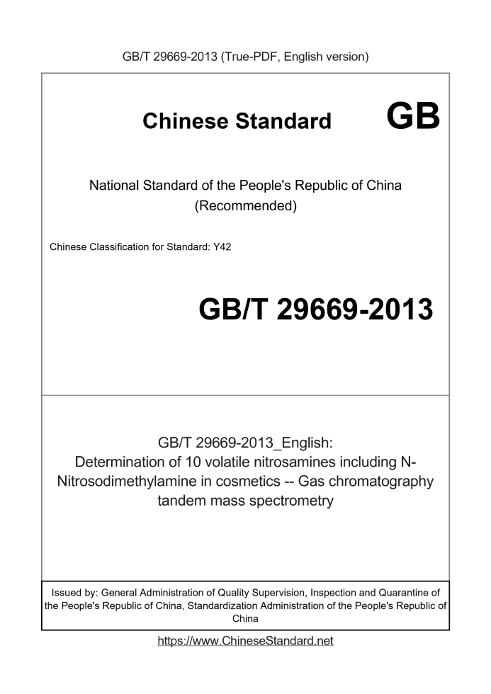 GB/T 29669-2013: Determination of 10 volatile nitrosamines including N-Nitrosodimethylamine in cosmetics -- Gas chromatography tandem mass spectrometry