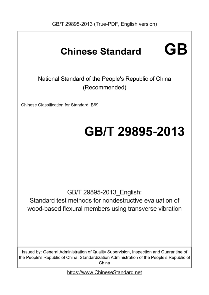 Delivery: <= 3 days. True-PDF full-copy in English will be manually translated and delivered via email. GB/T 29895-2013: Standard test methods for nondestructive evaluation of wood-based flexural members using transverse vibration Status: Valid