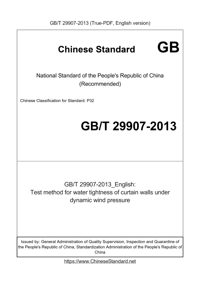 Test method for watertightness of curtain walls under dynamic wind pressure ICS 91.060.10 P32 National Standards of People's Republic of China Building walls dynamic wind pressure water tight performance Detection method Issued on. 2013-11-27 2014-08-01 implementation Administration of Quality Supervision, Inspection and Quarantine of People's Republic of China Standardization Administration of China released