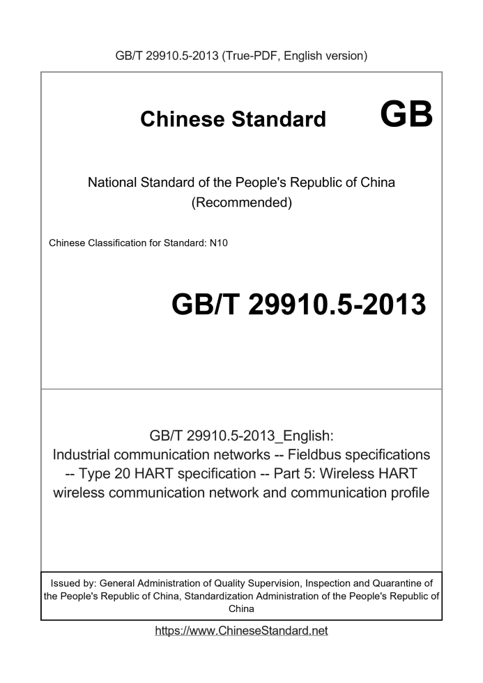 Delivery: <= 10 days. True-PDF full-copy in English will be manually translated and delivered via email. GB/T 29910.5-2013: Industrial communication networks -- Fieldbus specifications -- Type 20 HART specification -- Part 5: Wireless HART wireless communication network and communication profile Status: Valid