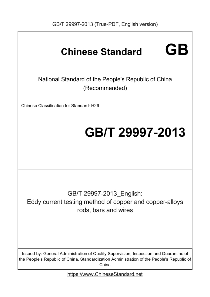 Delivery: <= 3 days. True-PDF full-copy in English will be manually translated and delivered via email. GB/T 29997-2013: Eddy current testing method of copper and copper-alloys rods, bars and wires Status: Valid