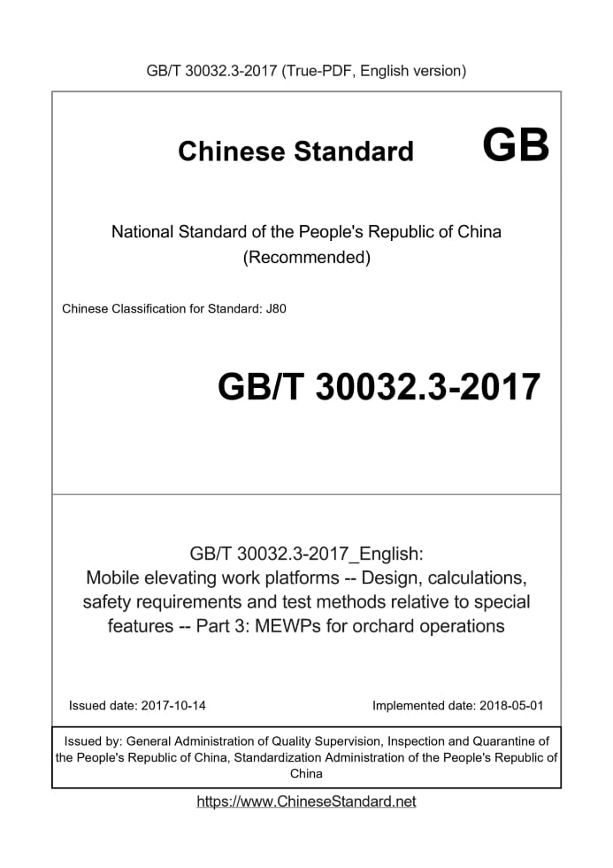 Delivery: <= 3 days. True-PDF full-copy in English will be manually translated and delivered via email. GB/T 30032.3-2017: Mobile elevating work platforms -- Design, calculations, safety requirements and test methods relative to special features -- Part 3: MEWPs for orchard operations Status: Valid