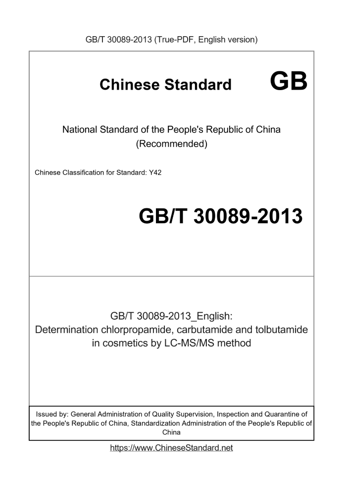 Delivery: <= 3 days. True-PDF full-copy in English will be manually translated and delivered via email. GB/T 30089-2013: Determination chlorpropamide, carbutamide and tolbutamide in cosmetics by LC-MS/MS method Status: Valid