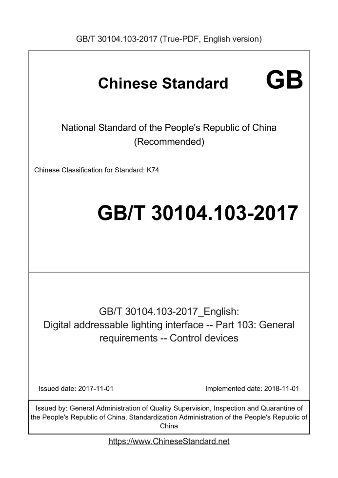 Delivery: <= 14 days. True-PDF full-copy in English will be manually translated and delivered via email. GB/T 30104.103-2017: Digital addressable lighting interface -- Part 103: General requirements -- Control devices Status: Valid