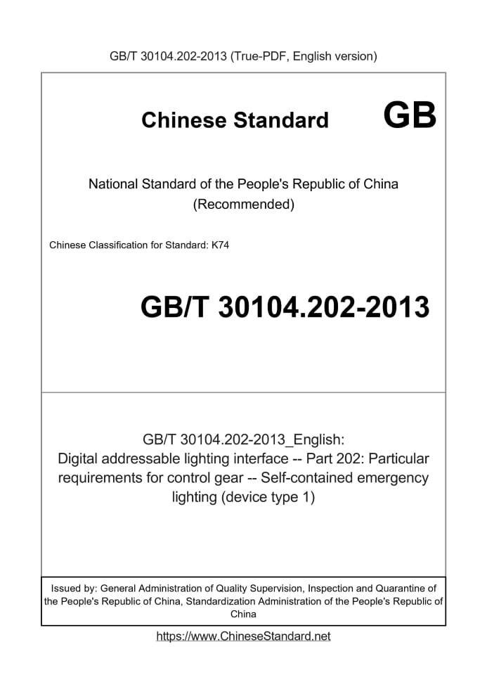 Delivery: <= 7 days. True-PDF full-copy in English will be manually translated and delivered via email. GB/T 30104.202-2013: Digital addressable lighting interface -- Part 202: Particular requirements for control gear -- Self-contained emergency lighting (device type 1) Status: Valid