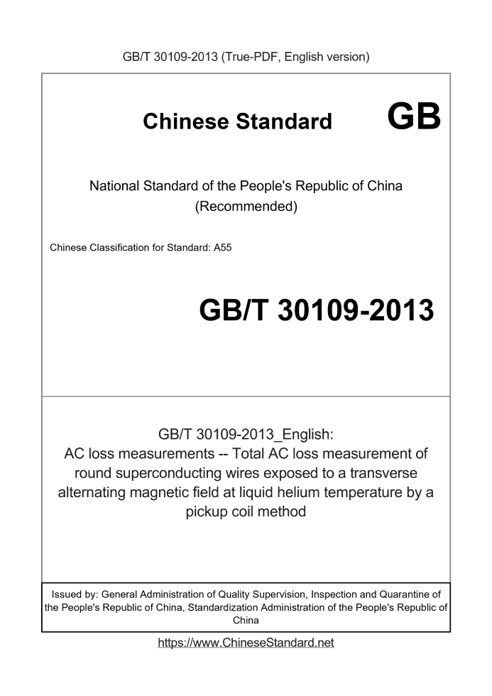 AC loss measurements.Total AC loss measurement of round superconducting wires exposed to a transverse alternating magnetic field at liquid helium temperature by a pickup coil method ICS 17.220.20 A55 National Standards of People's Republic of China AC loss measurements at liquid helium temperatures alternating transverse Magnetic field superconducting wire circular cross-section of the total exchange loss Detection coil measurements (IEC 61788-8Ed.2.2010, IDT) Issued on. 2013-12-17 2014-05-15 implementation Administration of Quality Supervision, Inspection and Quarantine of People's Republic of China Standardization Administration of China released