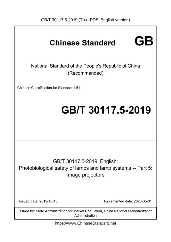 Delivery: <= 7 days. True-PDF full-copy in English will be manually translated and delivered via email. GB/T 30117.5-2019: Photobiological safety of lamps and lamp systems -- Part 5: Image projectors Status: Valid