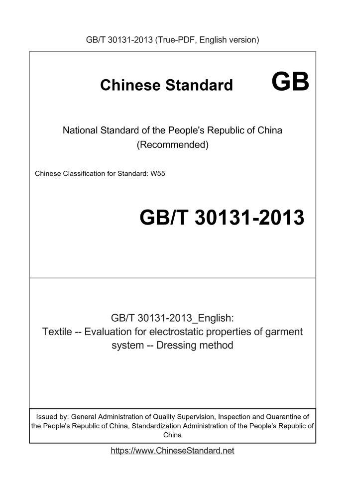 | GB/T 30131-2013 English PDFUS$209.00 · In stock Delivery: <= 3 days. True-PDF full-copy in English will be manually translated and delivered via email. GB/T 30131-2013: Textile -- Evaluation for electrostatic properties of garment system -- Dressing method Status: Valid